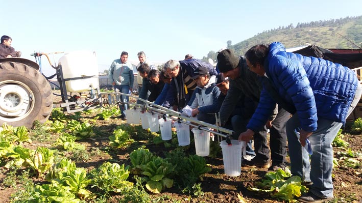 El volumen de aplicación, señaló Abarca, debe ser acorde a lo recomendado en la etiqueta del plaguicida, respetando la dosis requerida de ingrediente activo por superficie, para ello, se determina la velocidad apropiada del tractor, en consideración al tipo de boquilla que se utilice. Por ejemplo, si el caudal individual promedio de las boquillas es de 0,9 L/min, distanciadas a 0,5 m en la barra y se requiere aplicar 200 L/ha, entonces la velocidad de avance apropiada será de 5,4 km/h (0.9 L/min x 600 / 0.5 m / 200 L/ha = 5.4 km/h), si la caja de velocidades del tractor no entrega la velocidad exacta requerida, se utiliza una cercana y se ajusta el caudal de las boquillas con presiones de trabajo, entre 2 a 4 bar (para pulverizadores hidráulicos de barra, se recomienda que se utilice al menos 450 r.p.m. a la toma de fuerza del tractor). Es importante recordar que el suelo donde se aplique el herbicida, no esté excesivamente húmedo, el suelo saturado y el paso de maquinaria pesada provocarán compactación y pérdida de la estructura del suelo, pero, además, se verá modificado el volumen de aplicación por un mayor patinaje del tractor. Puntualizó el profesional. Para pequeños productores, es habitual el uso de pulverizadores hidráulicos de mochila, conocidos comúnmente como "bombas de espalda", para este caso, como lo normal es utilizar una sola boquilla, se opta por las de tipo deflectora tipo espejo, con caudales entre 0,9 a 1,2 L/min para herbicidas de preemergencia. En aplicaciones con motos de cuatro ruedas, tienden a utilizar una velocidad mayor a los tractores, por lo tanto, si las boquillas a utilizar son de tipo hidráulico (que forman la gota por presión de líquido), estas deben ser de mayor caudal a las utilizadas con tractor, para asegurar un buen cubrimiento y la dosis por hectárea recomendada
