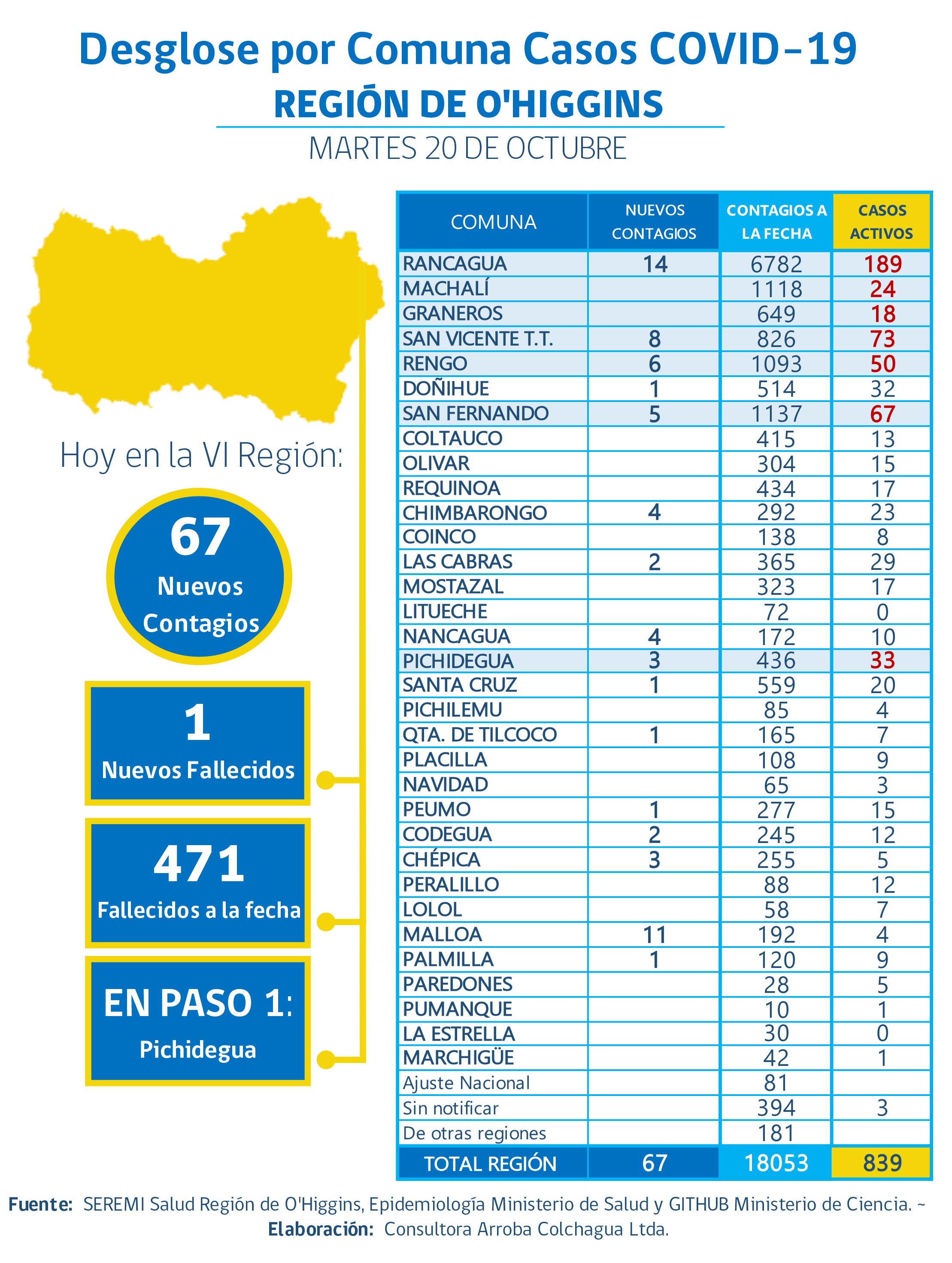El desglose de casos por comunas es el siguiente, Rancagua 14 casos, Malloa 11, San Vicente 8, Rengo 6, San Fernando 5 casos, Chimbarongo 4, Nancagua 4, Chépica 3, Pichidegua 3, Codegua 2, Las Cabras 2, Doñihue 1, Palmilla 1, Peumo 1, Quinta de Tilcoco 1 y Santa Cruz 1.