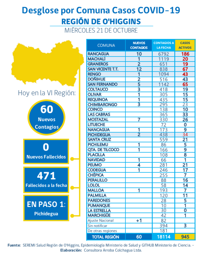 El desglose por comunas es el siguiente, 12 casos en San Vicente, 10 casos en Rancagua, 7 en Mostazal, 5 en San Fernando, 4 en Peumo, 3 en Chimbarongo, 3 en Coltauco, 2 en Doñihue, 2 en Graneros, 2 en Pichidegua, 1 en Codegua, 1 en Machalí, 1 en Malloa, 1 en Nancagua, 1 en Navidad, 1 en Olivar, 1 en Pichilemu, 1 en Quinta de Tilcoco, 1 en Rengo y 1 en Requínoa.