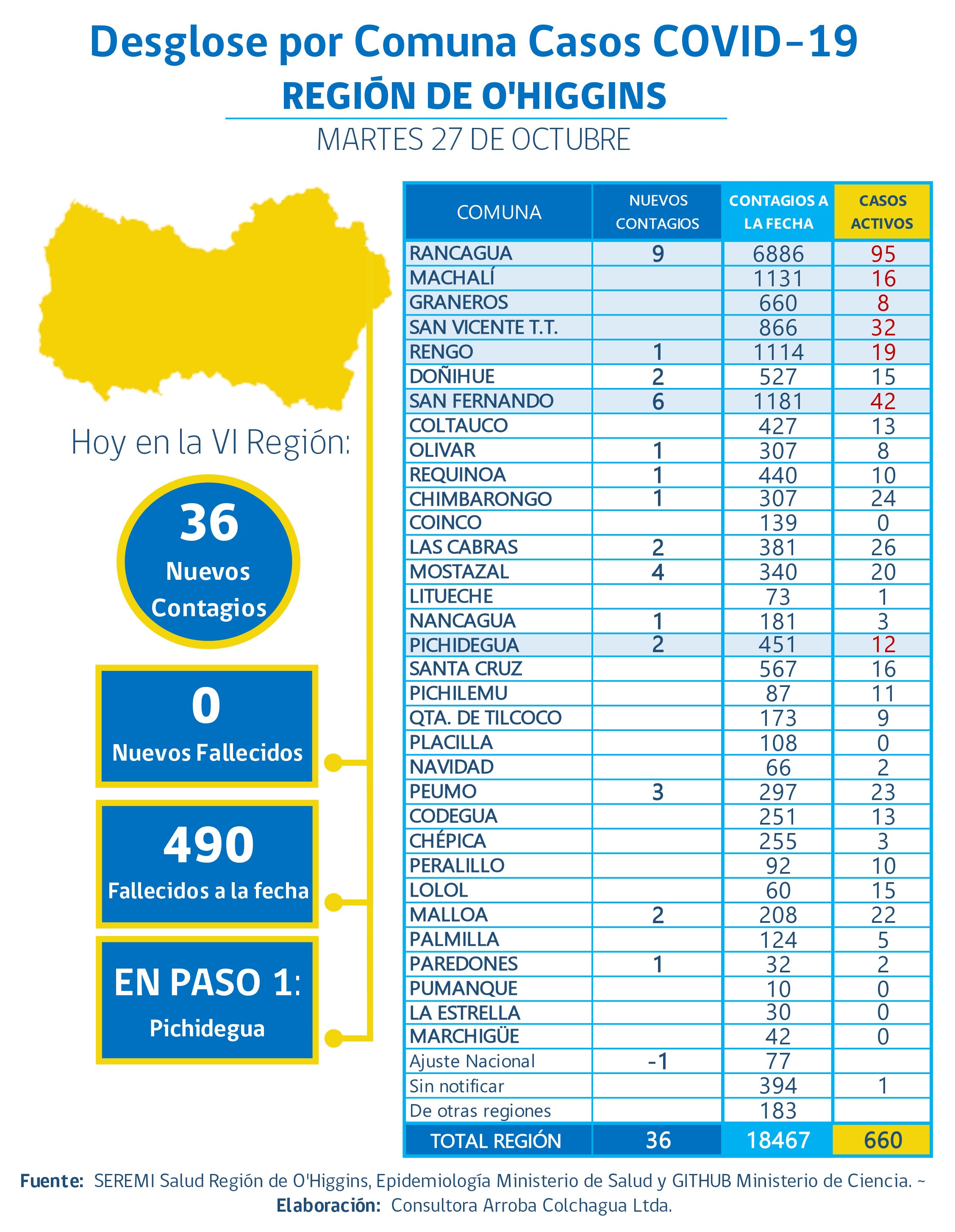 El desglose por comunas es el siguiente 9 casos en Rancagua, 6 casos en San Fernando, 4 en Mostazal, 3 en Peumo, 2 en Doñihue, 2 en Las Cabras, 2 en Malloa, 2 en Pichidegua, 1 en Chimbarongo, 1 en Nancagua, 1 en Olivar, 1 en Paredones, 1 en rengo y 1 en Requínoa.