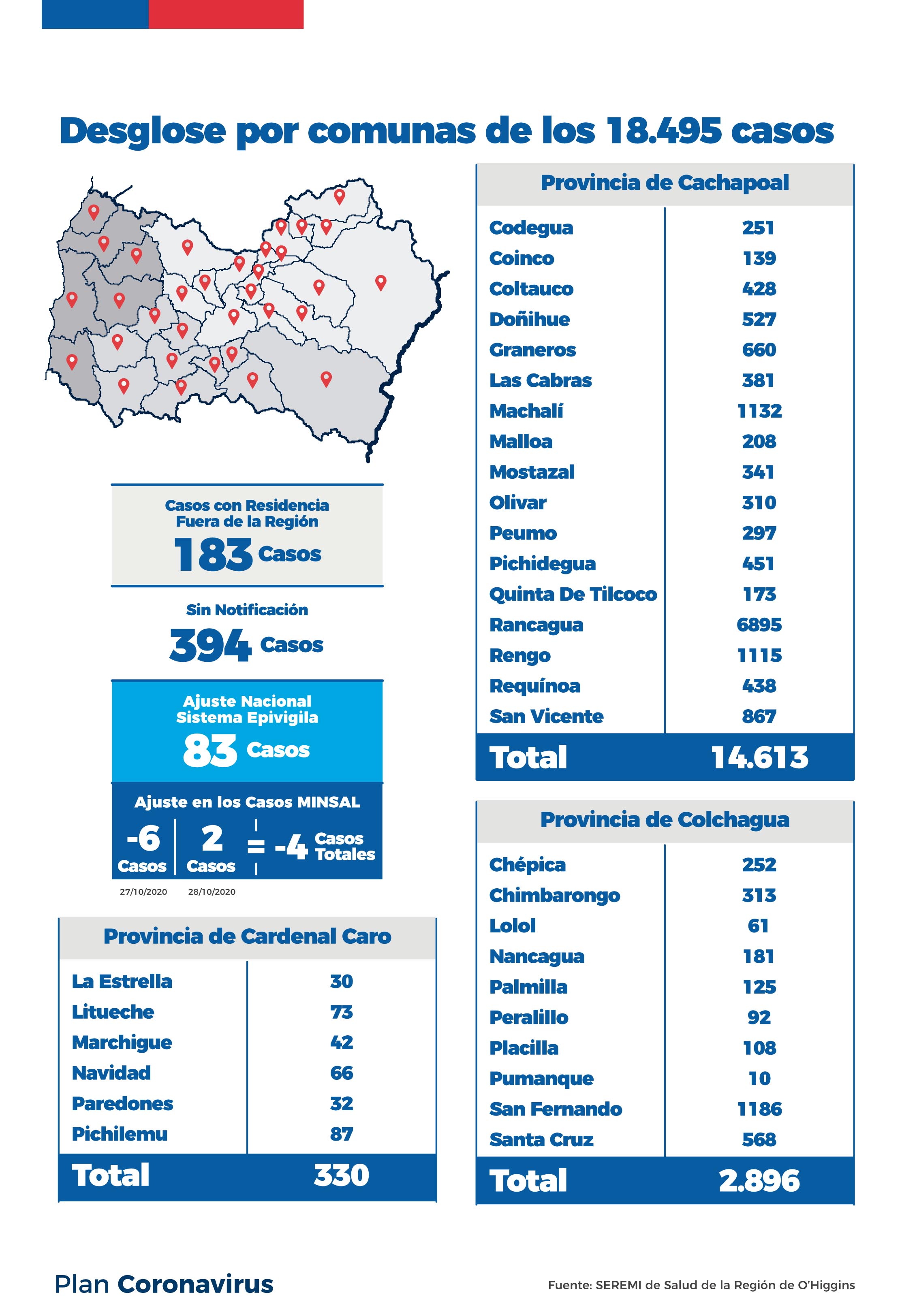 El desglose por comunas es el siguiente, 9 casos en Rancagua, 5 en San Fernando, 2 casos en Chépica y un caso en las comunas de Chimbarongo, Coltauco, Lolol, Machalí, Mostazal, Palmilla, Rengo, Requínoa y San Vicente de Tagua Tagua y 1 caso en Santa Cruz.