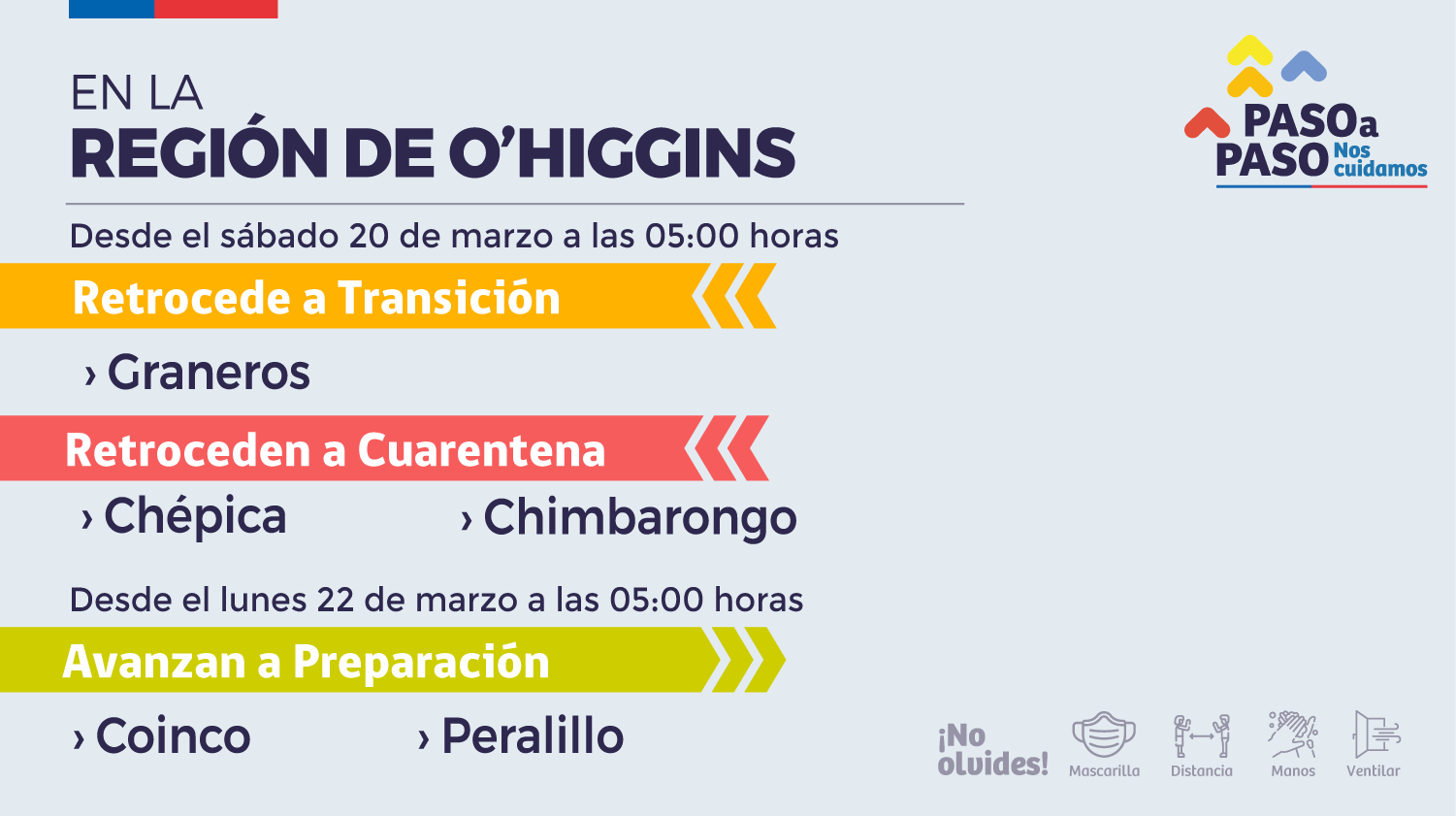En el informe del Ministerio de Salud de hoy jueves, tres comunas de la región de O’Higgins retrocederán en el Plan Paso a Paso, mientras que solamente dos avanzarán en estas fases. Chimbarongo y Chépica estarán en cuarentena a partir de este sábado 20 de marzo a las 05:00 horas, mientras que la comuna de Graneros entrará en Transición (Paso 2), quienes tendrán confinamiento los fines de semana. Las únicas comunas que avanzan, son Peralillo y Coínco que desde el lunes 22 a las 05:00 horas estarán en la fase de Preparación (Paso 3).