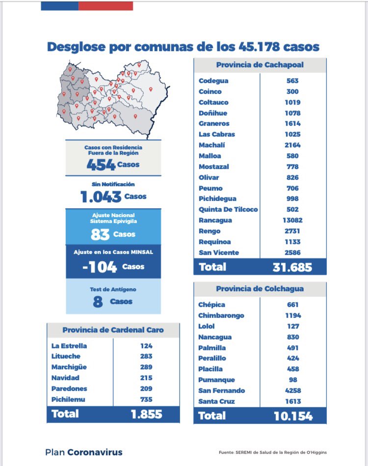 El desglose por comunas es el siguiente: Rancagua 67 casos, San Fernando 26, Graneros 25, Machalí 13, San Vicente y Rengo 12 casos, Chimbarongo 11, Coltauco 10, Paredones 9, Chépica, Pichidegua y Mostazal 7 casos, Placilla y Santa Cruz 6 casos, Codegua, Requínoa y Nancagua 4 casos, Las Cabras, Navidad, Palmilla, Peralillo, Quinta de Tilcoco y Pichilemu 3 casos, Peumo y Malloa 2 casos, Coínco, Litueche, Lolol, Marchigüé y Olivar 1 caso, Otras regiones 1 y Sin Notificar 11 casos.