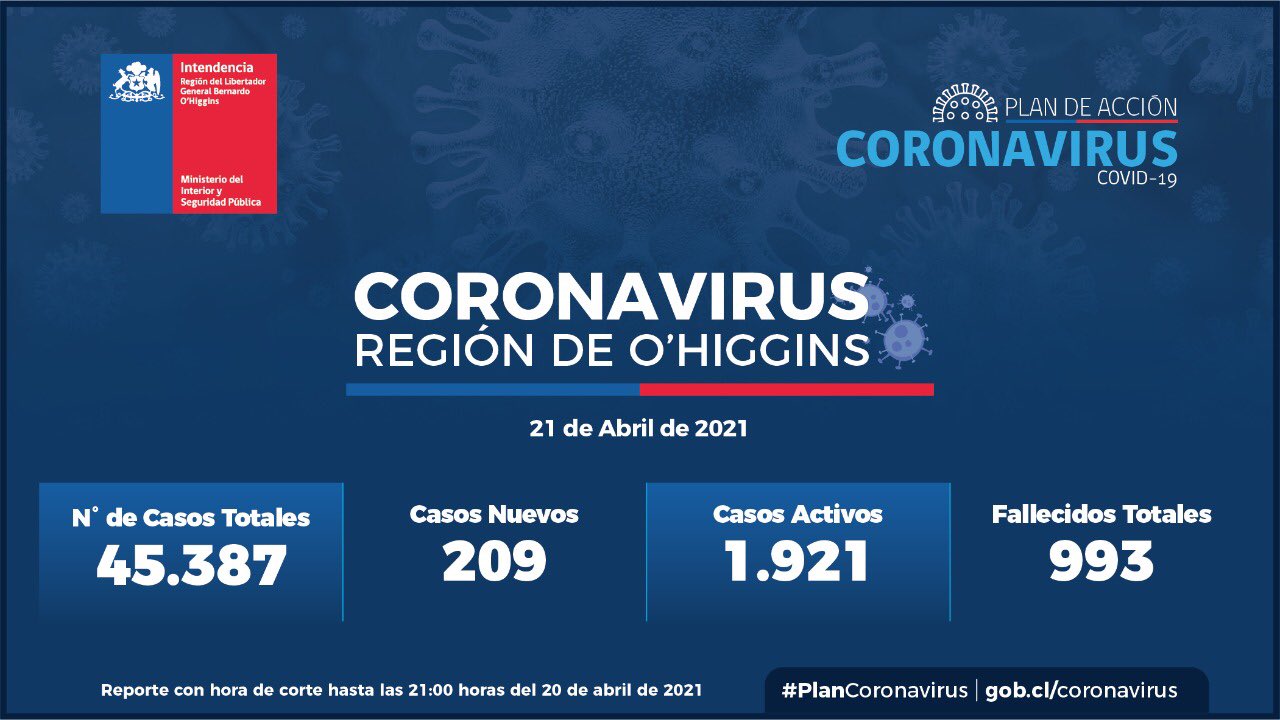 No se reportó pacientes fallecidos a causa de la pandemia en la región durante las últimas horas por lo que la cifra se mantiene en 993 decesos. El total de casos registrados en O'Higgins desde la llegada del coronavirus al país son 45.387.