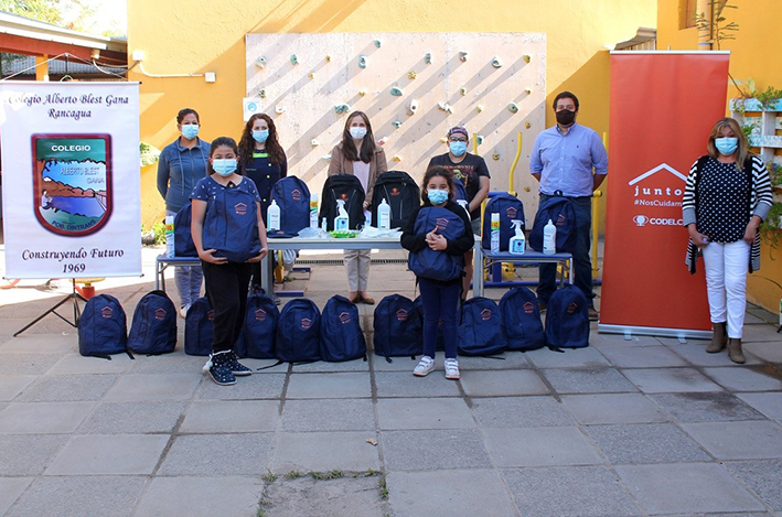 Codelco División El Teniente entregó 180 mochilas con kits sanitarios para estudiantes y además docentes y auxiliares del colegio Alberto Blest Gana de esa población de Rancagua.