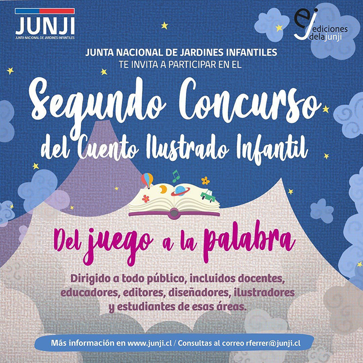 En el marco del Mes del Libro y en ocasión de la presentación de La esquila- cuento ganador del primer concurso literario organizado por la Junta Nacional de Jardines Infantiles (JUNJI)- dicha institución convocó a participar en su SEGUNDO CONCURSO DEL CUENTO ILUSTRADO, Del juego a la palabra, que busca abrir el área editorial de la JUNJI para crear nuevas obras dirigidas a niños y niñas en etapa parvularia que contengan una propuesta original de contenidos en el marco de la atención educativa y de formación inicial que ofrece la institución.