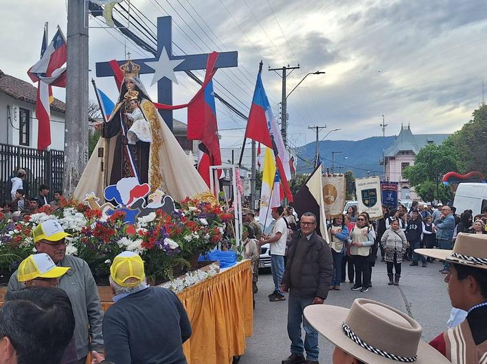 Las cuatro parroquias celebraron el Día de la oración por Chile. Peregrinando desde la Parroquia Nuestra Señora del Carmen, siendo la primera estación dedicada a los jóvenes, de catequesis quienes llevaban una gran bandera chilena, así siguió por las calles con nuestra Madre y Reina de Chile, siempre vitoreada con pañuelos blancos y banderas chilenas desde niños a adultos mayores.